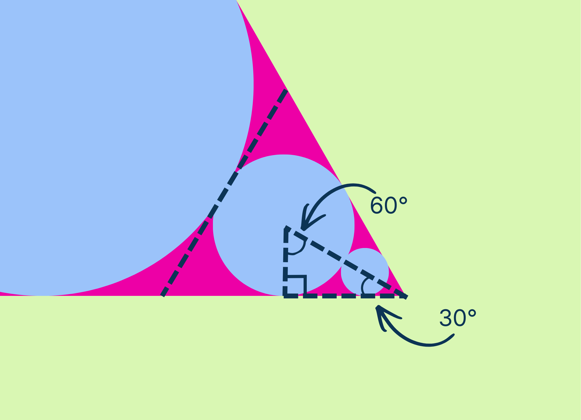 Finding the sum of the areas will require us to do a little more math. This time we really need to know the radii of each of the circles. We can start by finding the radius of the second-biggest circle. To do this, we draw the following line tangent to the center circle, and a new right triangle: