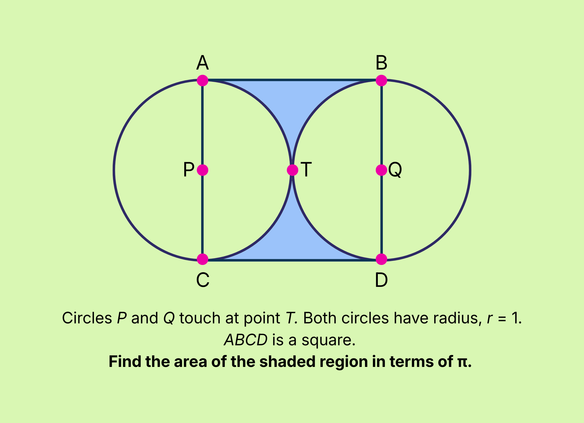 In a classic circle-meets-square scenario, here we have identical circles P and Q touching at point T, which is the center of square ABCD. If we rearrange the two semicircles inside square ABCD to form a circle, we can see that to find the area of the shaded region, we must first find the area of square ABCD and the area of circle P or Q, and then subtract the area of one circle from the area of square ABCD.