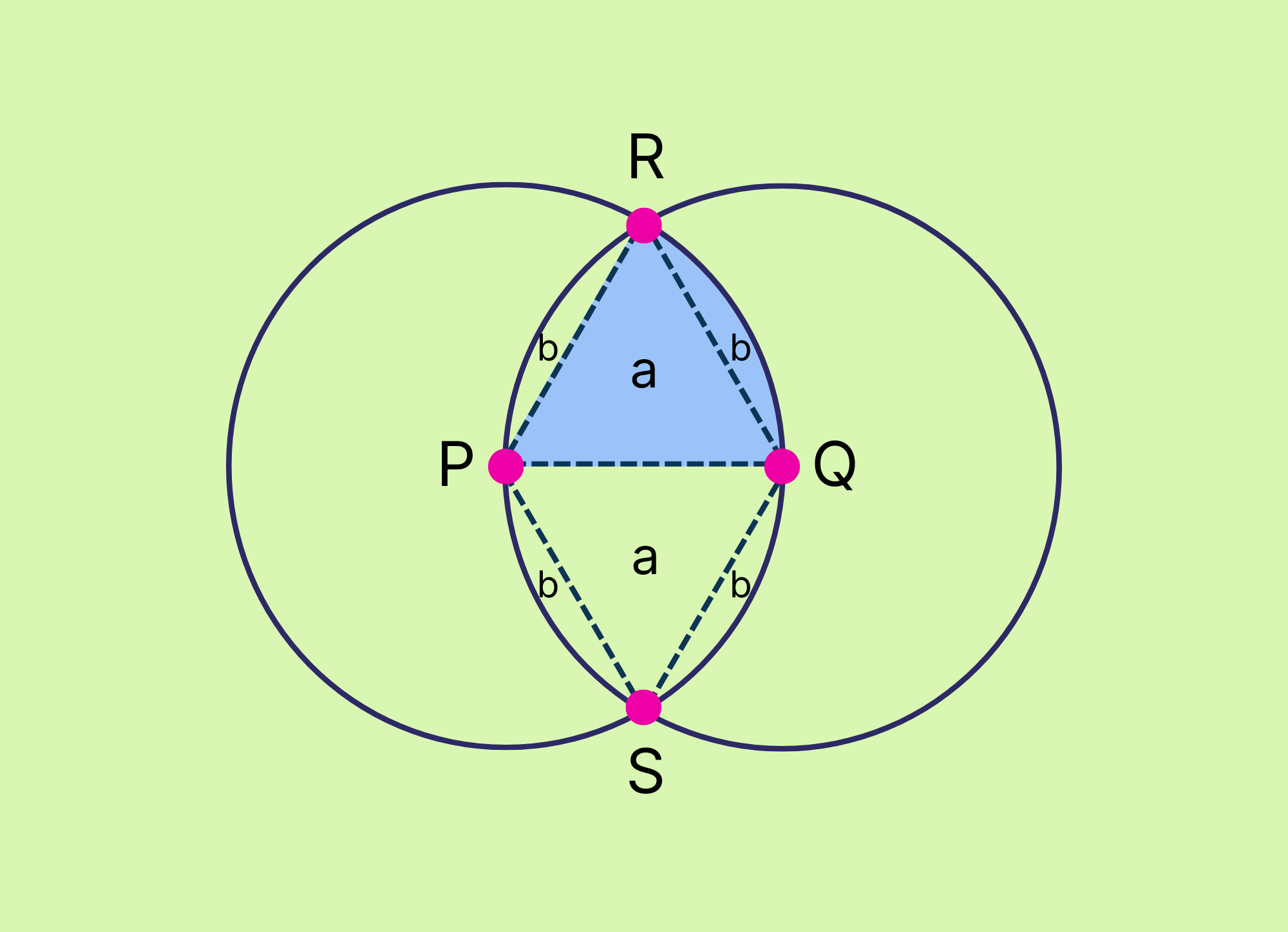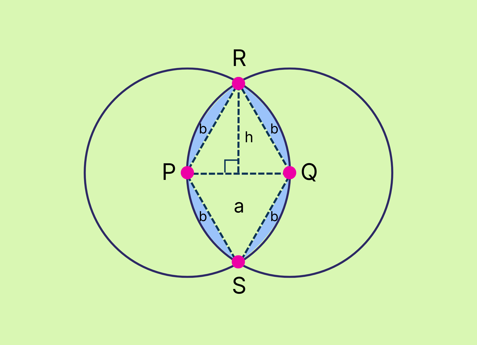 This is where things start to get tricky. We can’t find the area of this shaded region until we inscribe some equilateral triangles. After inscribing \(\Delta PRQ\) and \(\Delta PQS\), we can see that the area of the shaded region comprises 2 equilateral triangles and 4 slivers: \(A = 2a + 4b\).
